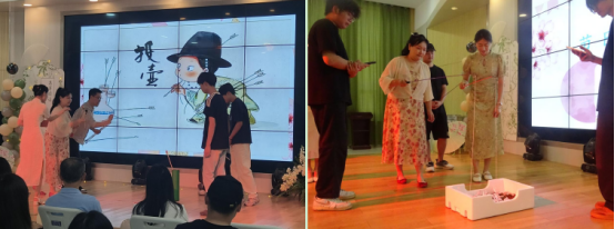 下一环节,投壶和鱼竿钓粽子巧妙地将传统游戏元素与现代娱乐形式相结合,教师们个个跃跃欲试。投壶游戏中,各位教师展现了精准的投掷技巧。而在鱼竿钓粽子游戏中,大家则体验了别样的垂钓乐趣。游戏现场欢声笑语不断,气氛和谐而融洽。