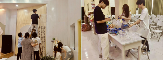 同学们早早来到现场,全部加入布置活动的会场中,忙得不亦乐乎。有的打气球、有的挂背景、有的摆物品,还有的拉彩灯,只为给今天到场参加集体生日会的老师们一份惊喜和满意。