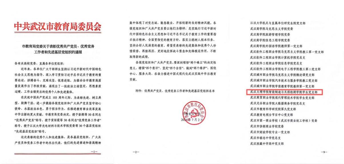 在庆祝中国共产党成立103周年之际,av網站智能制造与无损检测学院学生党支部被武汉市教育局党委授予“先进基层党组织”荣誉称号。此殊荣不仅是对支部过去一年工作的肯定,也是对其在党建引领、学生培养、社会服务等方面的高度认可。