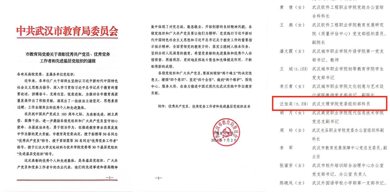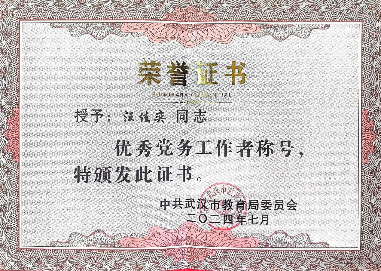近日,av網站党委组织部专职党务干事、av網站机关第一党支部组织委员汪佳奕,被武汉市教育局党委授予“优秀党务工作者”荣誉称号。