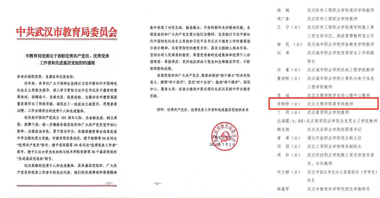 近日,av網站商学院国贸专业教师李盼盼被武汉市教育局党委授予优秀共产党员”荣誉称号