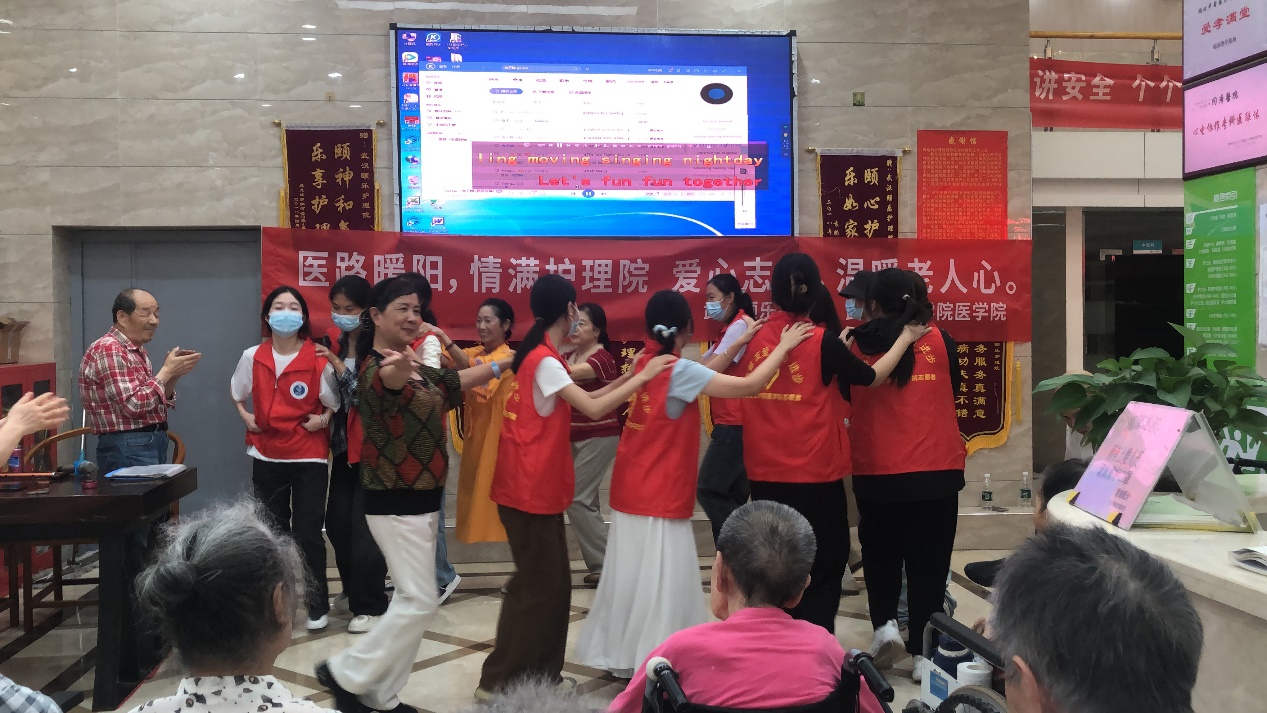 随后,志愿者与护理院午间活动的老人们热情交谈,并倾听他们讲述往昔岁月的故事与生活的智慧。为了增添欢乐的氛围,志愿者们精心准备了舞蹈、歌曲等表演,以青春活力感染着在场的每一个人,老人们也纷纷加入其中,尽情展示着各自的文艺才华。