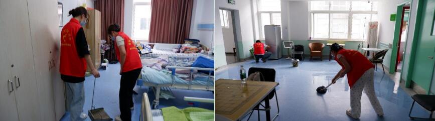 志愿服务当天,志愿者们分组进行义务劳动。他们身着统一服装,帮助护理院整理环境、清洁卫生,为老人们营造一个更加舒适整洁的生活环境。