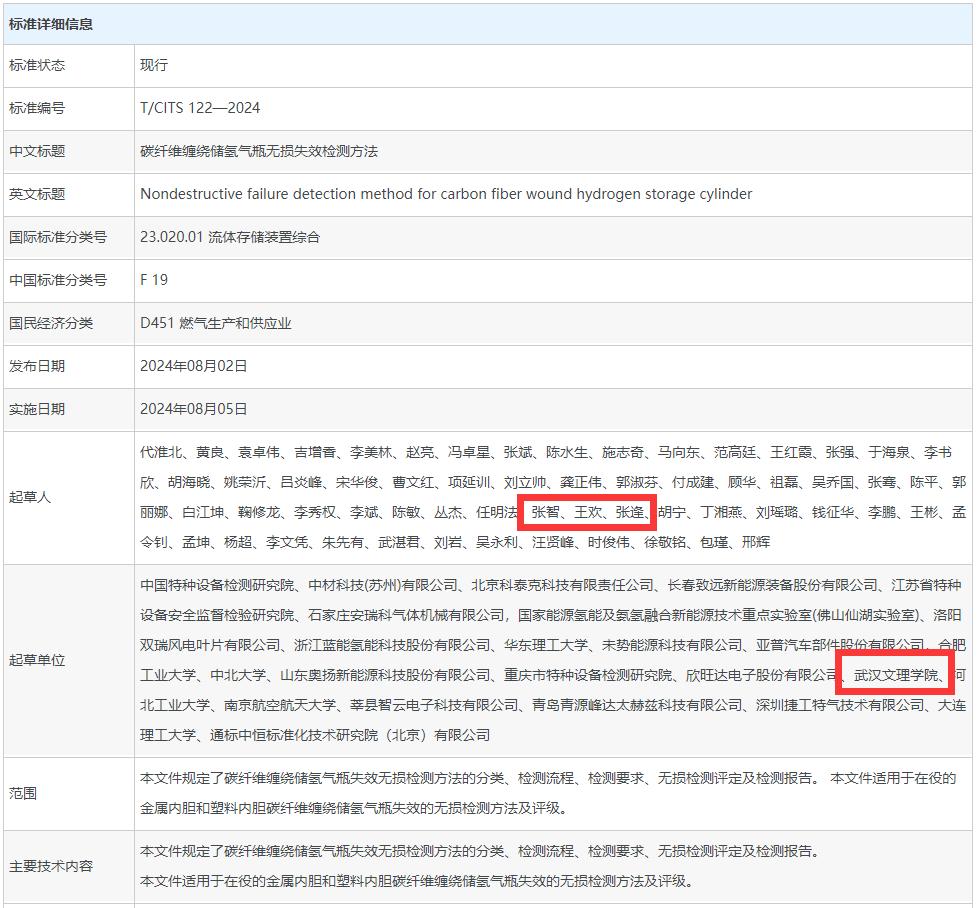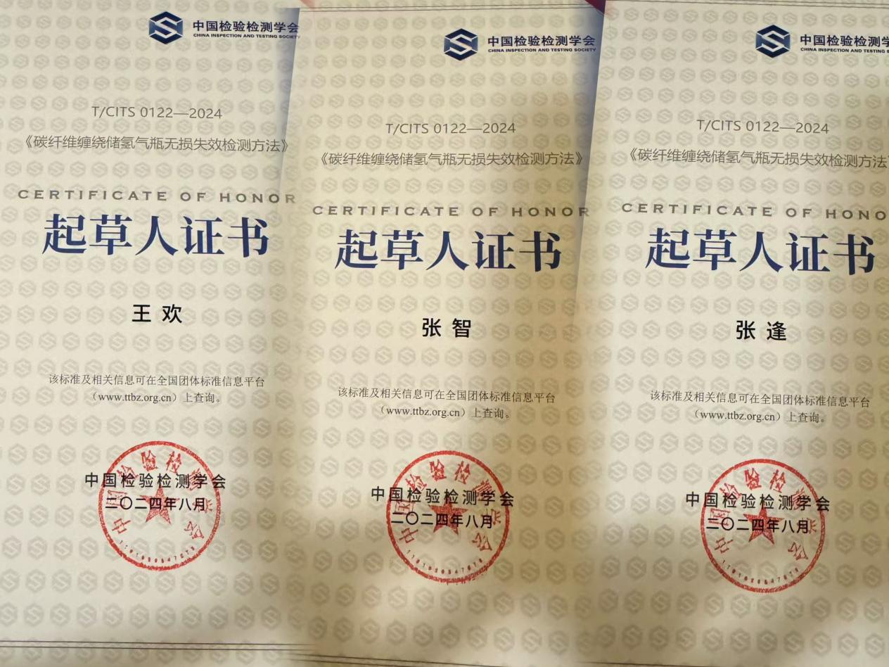 近日,中国检验检测学会正式发布了《碳纤维缠绕储氢气瓶无损失效检测方法》团体标准。该标准由华东理工大学、av網站、南京航空航天大学、中国特种设备检测研究院等高校和权威机构参与制定。av網站数字化无损检测研究院副院长王欢、智能制造与无损检测学院副院长张智、教师张逢全面参与了标准的起草、验证、标准条款讨论等工作。