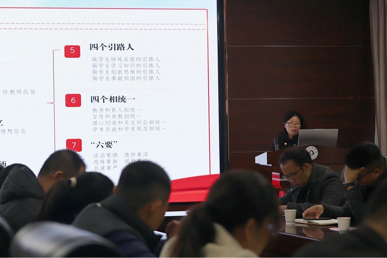 党委教师工作部副部长蔡锋利以《德为师之本,师以德为先》为题作主旨宣讲。她的宣讲报告聚焦“新时代下的师德师风”这一重要议题,深入分析了当前影响师德师风的各种消极因素,详细解读了教育部印发的《新时代高校教师职业行为十项准则》,并通过对若干起违反师德师风典型案例的分析,警示教职工要以案为鉴,时刻保持警醒,自觉践行良好师德,严守师德师风底线,打造一支“铸师魂、育师德、树师表、正师风、练师能”的高素质教师队伍。