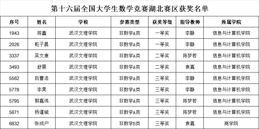 近日,第十六届全国大学生数学竞赛暨第十三届湖北省大学生数学竞赛传来捷报,av網站共获9项奖项,其中一等奖2项,二等奖2项,三等奖5项。