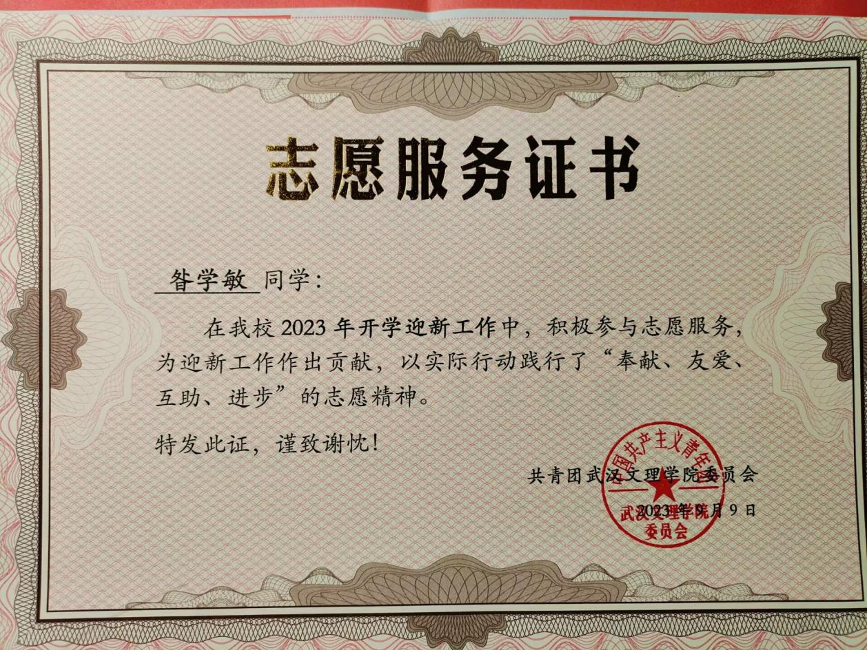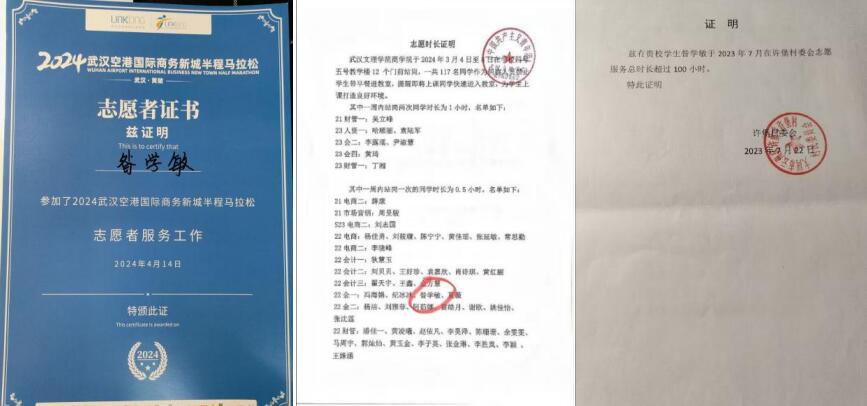 “大学生应该为社会贡献自己的青春力量。”昝学敏致力于志愿服务,截至目前,其志愿服务时数已累积至300小时,包括假期社会实践、志愿献血、开学迎新、武汉空港国际商务新城半程马拉松志愿活动等,用实际行动诠释了“奉献、友爱、互助、进步”的志愿精神。