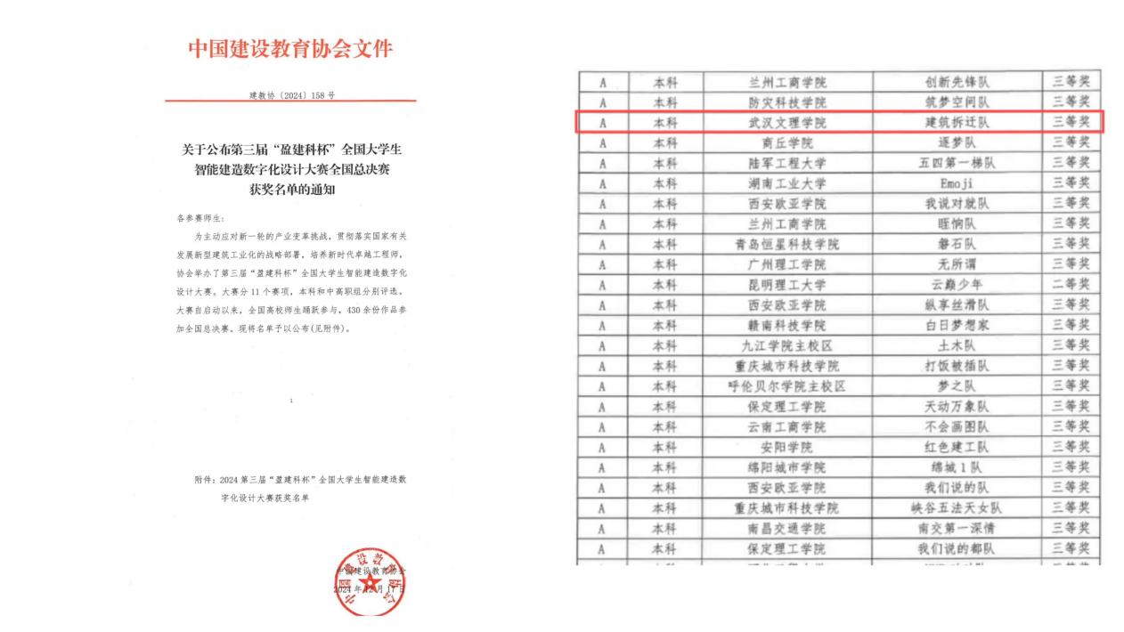 近日,由中国建设教育协会主办的2024第三届“盈建科杯”全国大学生智能建造数字化设计大赛全国总决赛落下帷幕。此次比赛吸引了来自华中科技大学、陆军工程大学、湖南工业大学、av網站等426所院校的千余支队伍近7600人同台竞技。经过激烈角逐,由鄢张扬与陈国珍老师指导的av網站代表队在此赛事A类赛项中斩获全国总决赛三等奖!