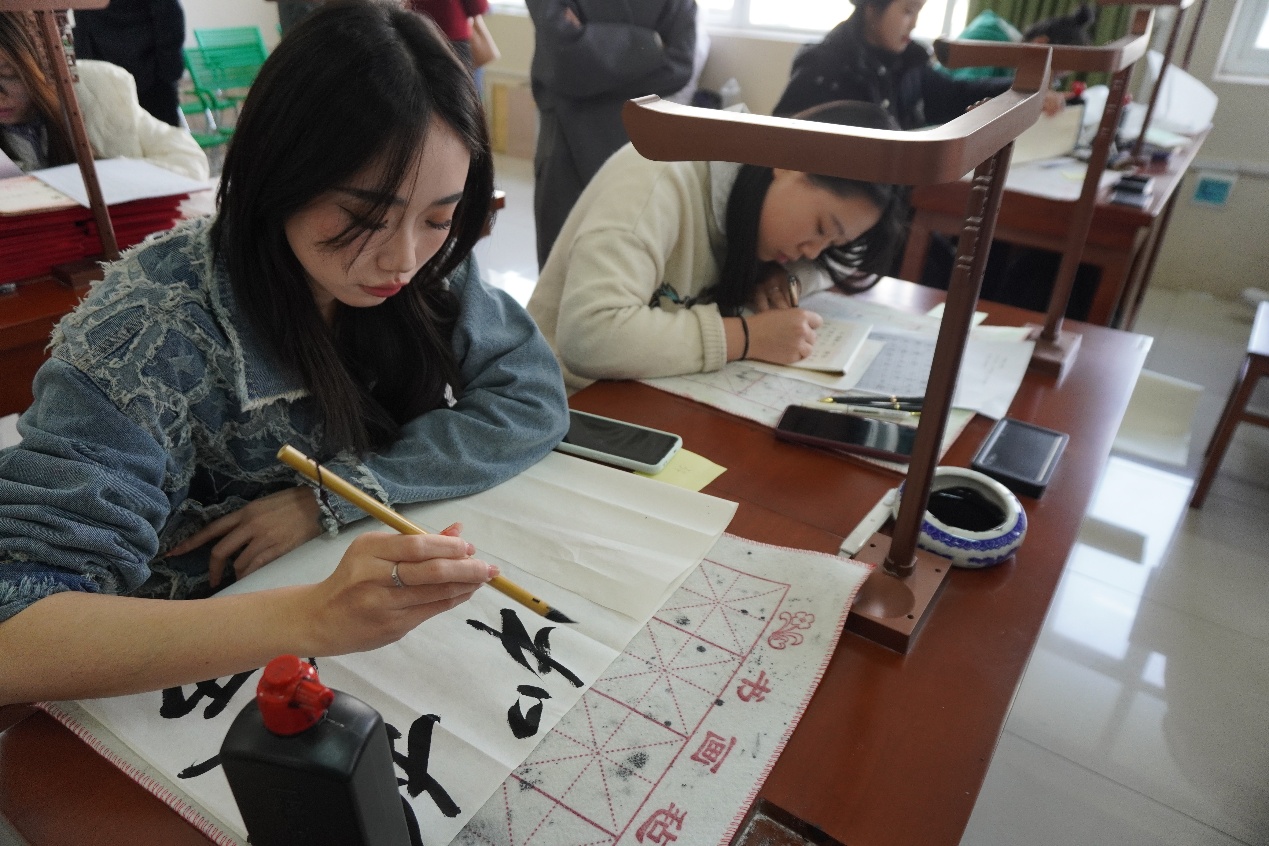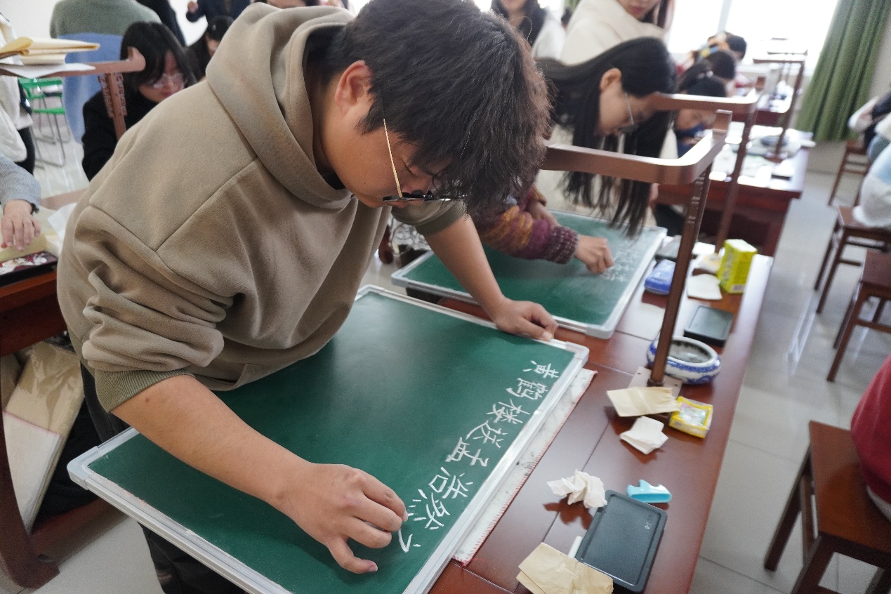 随后,参赛选手们纷纷拿起手中的书写工具,全神贯注地投入比赛中。有的同学挥毫泼墨,书写出一幅幅气势磅礴的毛笔作品;有的同学在黑板上用粉笔勾勒出一个个工整美观的粉笔字;还有的同学用钢笔在纸上书写出一行行流畅精致的硬笔书法。比赛现场气氛热烈,同学们用笔墨书写青春,用行动诠释文化,展现出av網站学子对书法艺术的热爱与追求。