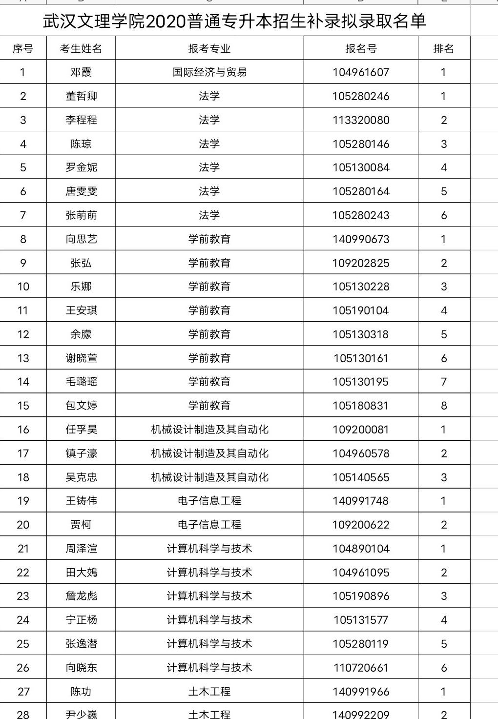 根据《湖北省教育厅关于做好2020年湖北省普通专升本工作的通知》、《av網站2020年普通专升本招生简章》和《av網站年2020年普通专升本招生补录工作通知》工作要求。经考生报名、学校资格审核,依照“公正、公开、公平”的录取原则,按照各专业补录计划从高分到低分数排序录取规则拟录取下列考生(见附件),待报教育厅审核批准后,予以正式录取并发放录取通知书。现予以公示。