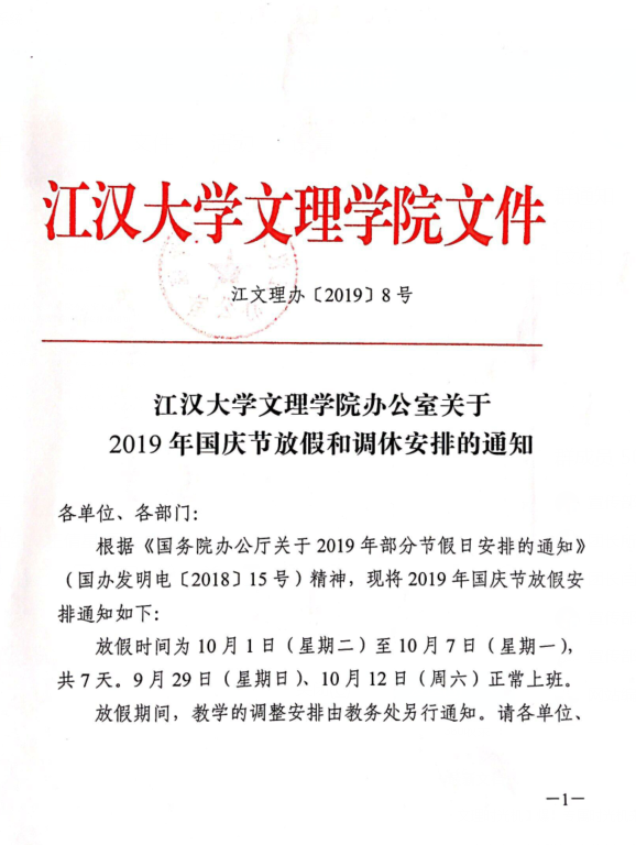 江汉大学av網站学院办公室关于2019国庆节放假和调休安排的通知