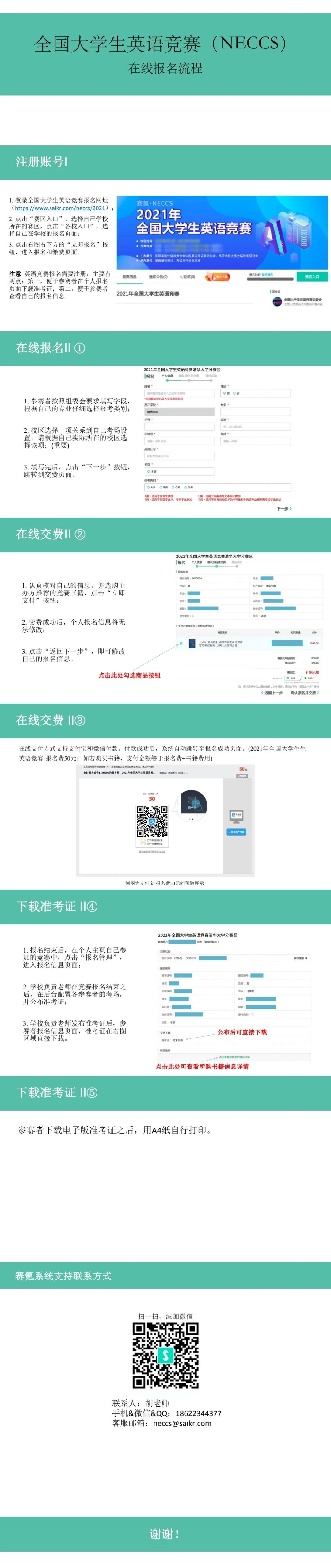 为了方便参赛同学报名及缴费,学校采用全国大学生英语竞赛组织委员会指定的赛氪网:https://www.saikr.com/neccs/2021在线报名系统进行网络报名(附件:全国大学生英语竞赛在线报名流程)。