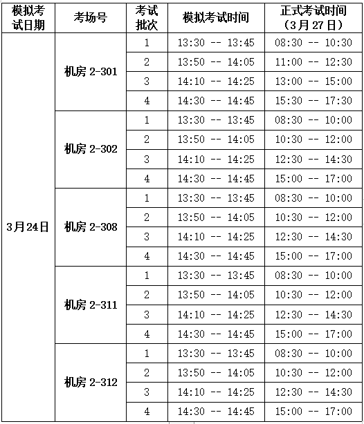 为了让参加2021年3月全国计算机等级考试的学生熟悉上机环境和流程,模拟机考将于3月24日下午13:30—14:45在av網站二号教学楼进行。具体时间安排如下: