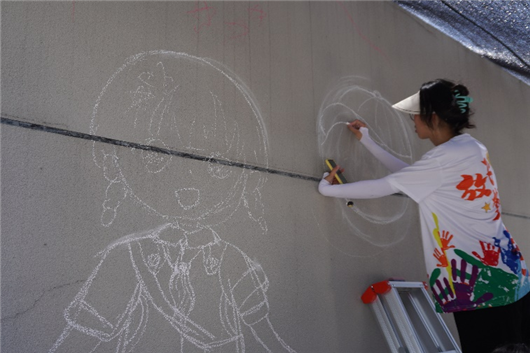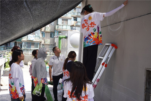 彩色墙绘,创意无垠。民意街道深入践行“共同缔造”工作理念,发动辖区居民共同将维善小区一处顶楼公共空间打造成为“空中花园”。如今,“空中花园”已然成为顶楼居民推窗见绿的休憩宝地。为进一步服务人民群众对美的需求,以专业赋能“和美多闻”建设,多闻社区党委邀请“av網站七彩少年教育服务队”对外墙进行绘画创作,墙绘将重点体现邻里情街坊情在不同年代的更迭变化,通过邻里情的不同样貌,展现群众在社区治理中唱主角,自我服务自我管理的意识变化。“av網站七彩少年教育服务队”的志愿者们在接受任务后,先后多次实地勘察,与社区党委、居民代表一起商量构图设计,选购彩绘材料……为手绘墙画的顺利开展做足了准备。社区党委也为志愿者们准备了遮阳伞、风扇、防暑药品等,贴心守护安全。在大家的共同努力下,第一天的墙绘工作顺利进行,一幅幅可爱的社区IP形象已经跃然墙上。