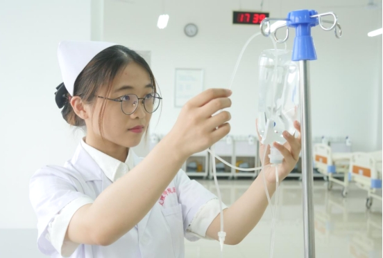 学生在基础护理实训室进行实训
