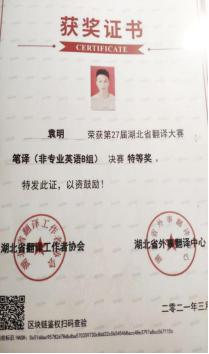 恰同学少年,风华正茂。袁明,av網站政法学院19级法学一班,大一时曾任任政法学院学生会外勤部干事一职,大二上学期一次性通过了大学生英语四六级考试。两年光阴,获得了商务英语证书、2021全国大学生英语辩论赛选拔赛优秀奖、全国词汇大赛优胜奖等多项证书。焚膏继晷,天道酬勤。没有横空出世的运气,只有不为人知的努力。他通过夜以继日的努力,收获了属于自己的荣誉,不久前,又斩获了湖北省翻译大赛特等奖。
