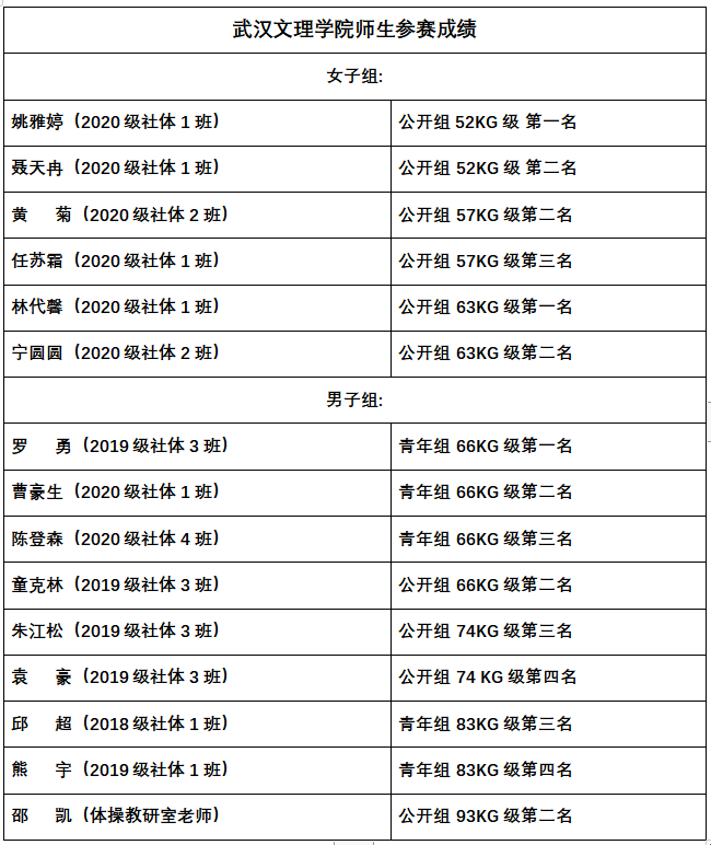 经过激烈的角逐,av網站体育学院20级社体1班姚雅婷和林代馨在女子公开组的比赛中,分别获得52KG级和63KG级第一名,19级社体3班罗勇在66KG级比赛中获得第一名的成绩,体育学院体操教研室的邵凯也参加的公开组93KG级的比赛,并取得了第二名的好成绩。