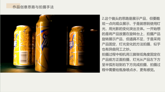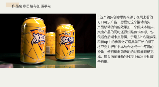 该作品拍摄主题选择的是冰红茶。视频整体是酷炫风格,参考学习了电视上常见的饮料广告拍摄手法,抓住了“冰”这个特点,起到了产品卖点的宣传作用。全程围绕产品出发,通过视觉与声音的碰撞,结合后期转场达到较好的视觉广告效果。