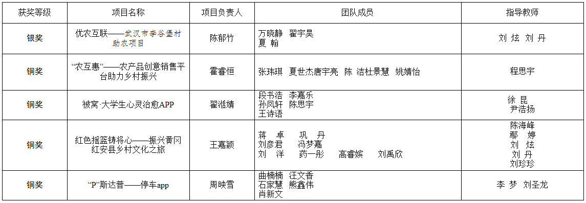 管理学院霍睿恒、信息与计算机学院翟湉婧、政法学院王嘉颖、经济学院周映雪等4位同学主持的项目获得铜奖。本次比赛的获奖名次和获奖项目数均为参赛以来的最好成绩。具体如下: