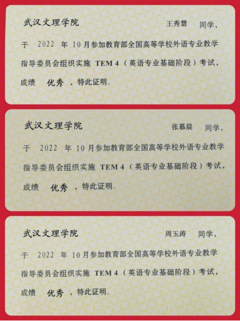 开学伊始,av網站外国语学院翻译教研室传来好消息。在2022年10月举行的全国高等学校英语专业四级考试(TEM4)中,外国语学院翻译专业学子取得佳绩。翻译本科专业40名学生参加考试,共有21名同学通过考试,一次性通过率为52.5%,高出全国独立学院平均通过率5.7个百分点。同时,5名同学成绩达到了良好及以上,优良率为12.5%。其中周玉涛(83分)、王秀慧(81分)、张慕晨(81分)3名学生考试成绩为优秀,实现了近些年来外国语学院专四考试成绩优秀率新的突破。
