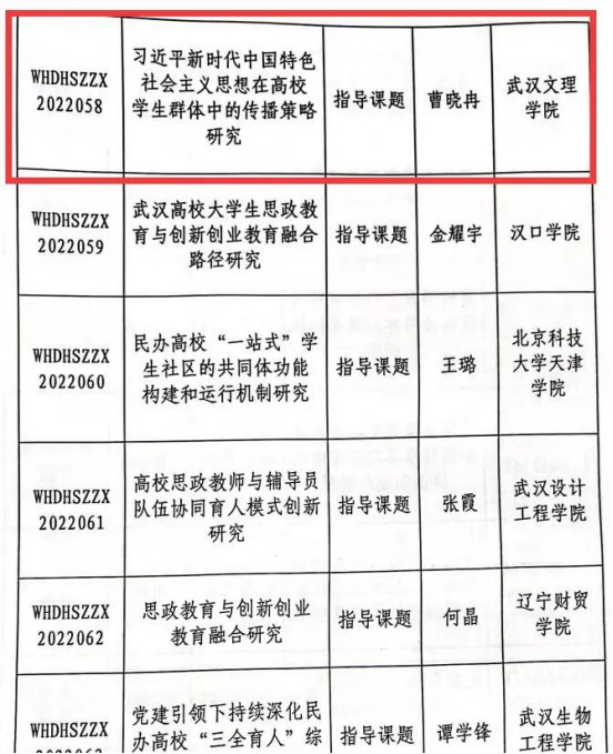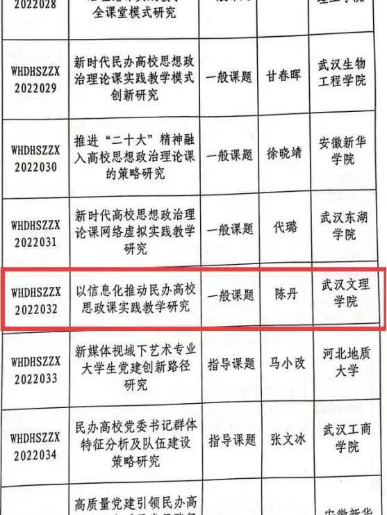 在近期公布的《教育部高校思想政治工作创新发展中心(武汉东湖学院)关于2022年度专项研究课题立项的通知》中,学校马克思主义学院陈丹老师申报的《以信息化推动民办高校思政课实践教学研究》(课题编号WHDHSZZX2022032)获批一般研究课题立项,曹晓冉老师申报的《习近平新时代中国特色社会主义思想在高校学生群体中的传播策略研究》(课题编号WHDHSZZX2022058)获批指导课题立项。这是学校首次获批教育部高校思想政治工作创新发展中心科研课题项目。