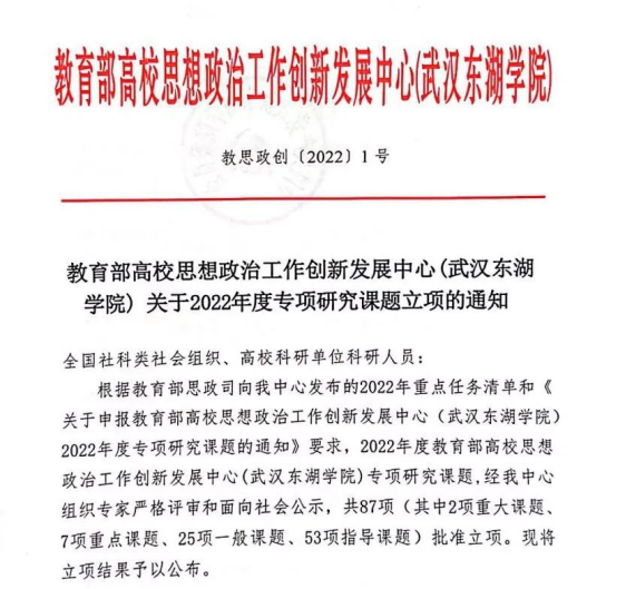 据悉,2022年度教育部高校思想政治工作创新发展中心(武汉东湖学院)专项研究课题,经中心组织专家严格评审和向社会公布,共87项(其中2项重大课题、7项重点课题、25项一般课题、53项指导课题)批准立项。学校马克思主义学院教师此次项目申报成功,丰富和拓宽了我校项目申报渠道,对进一步提升学校科研水平,调动教师科研积极性,具有重要的促进作用。