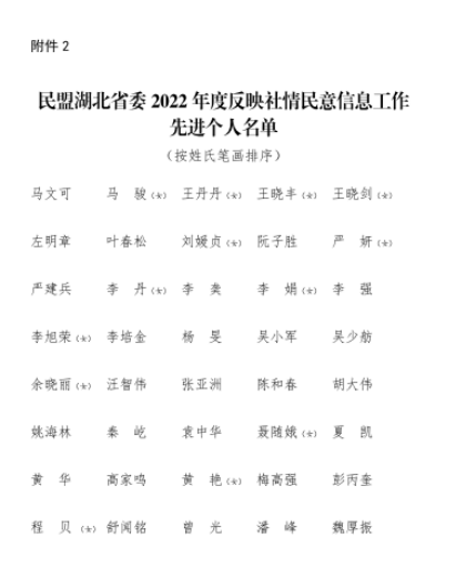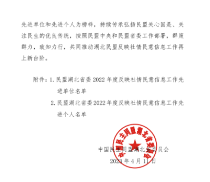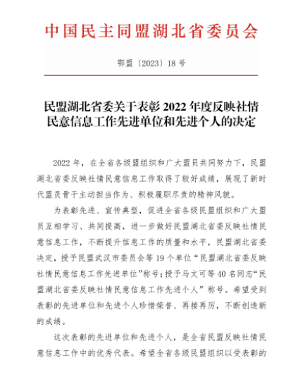 据悉,本次表彰的先进单位和先进个人,是全省民盟反映社情民意信息工作中的优秀代表,他们在传承弘扬民盟关心国是、关心民生,推动湖北民盟反映社情民意信息工作等方面做出贡献。