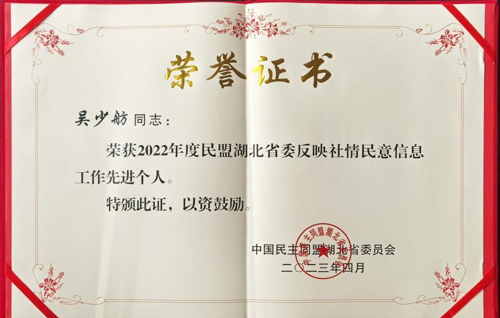 av網站图书馆副馆长吴少舫荣获 “民盟湖北省委反映社情民意信息工作先进个人”称号