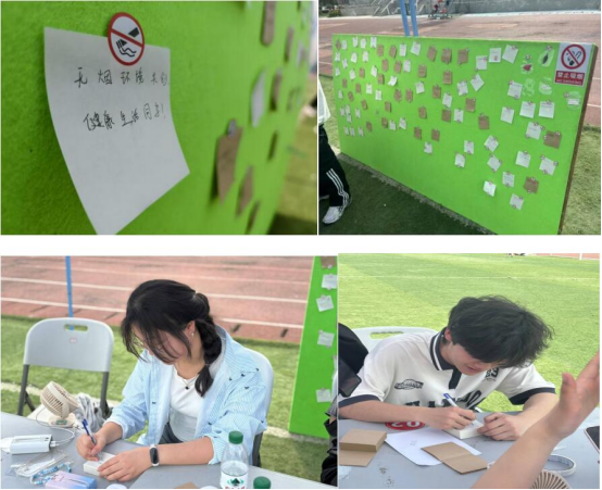 在“无烟校园”主题展区,“健康承诺窗”成为焦点。同学们用彩色便签书写控烟宣言。现场同步开展“吸烟危害知多少”趣味问答,发放《青少年控烟指南》宣传单。2024级学生王某某在便签上写道:“拒绝第一支烟,是对青春最好的尊重”,引发热烈共鸣