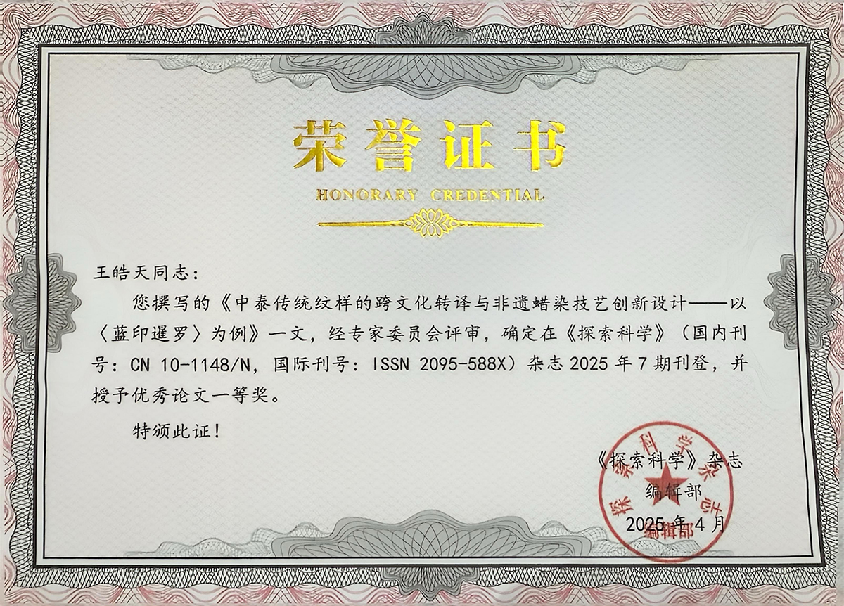av網站人文艺术学院“界外无界·2025”优秀毕业设计作品《蓝印暹罗》Indigo Siam荣获2025第三届西班牙ROCA设计奖铜奖,其深度解析创作理念的论文《中泰传统纹样的跨文化转译与非遗蜡染技艺创新设计——以〈蓝印暹罗〉为例》亦发表于《探索科学》2025年7月刊(ISSN2095-588X)。《蓝印暹罗》是人文艺术学院视觉传达设计专业2025届毕业生王皓天以“纹样转译”为核心,提出“共生美学”理念创作的毕业设计作品。