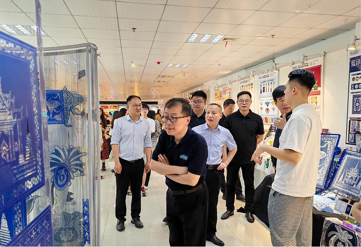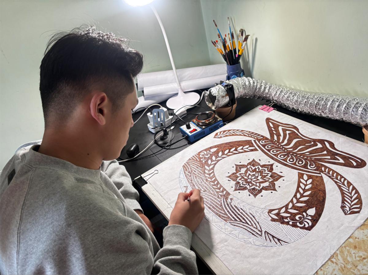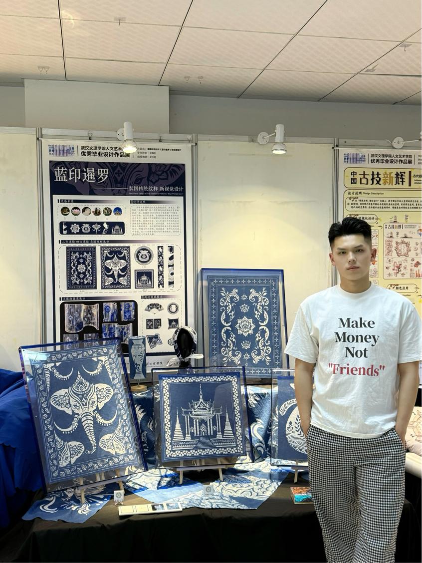 2024年夏天,王皓天在贵州深入学习非遗蜡染技艺时,偶然看到中泰建交50周年的纪念标识——中国龙与泰国娜迦交织成“50”字样,瞬间点燃了他的创作灵感,让他萌生了将中泰传统纹样通过蜡染技艺融合的大胆想法。他将传统非遗蜡染作为载体,大胆解构中泰两国代表性纹样的符号基因,在技艺框架内实现文化编码的创造性重组,将泰国传统纹样与中国国家级非物质文化遗产贵州蜡染技艺深度融合。其核心理念是通过跨文化对话激活传统工艺的当代生命力,并以此献礼中泰建交50周年。
