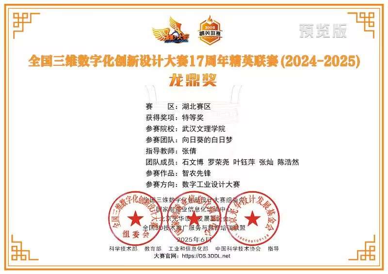 据悉,全国三维数字化创新设计大赛是在国家大力实施创新驱动发展战略、推动实体经济和数字经济融合发展的时代背景下开展的一项大型公益赛事,历经17年发展,已成为全国规模最大、影响力最广的数字化创新设计领域权威赛事之一。本届湖北赛区竞赛则吸引了湖北众多高校优秀团队参与。
