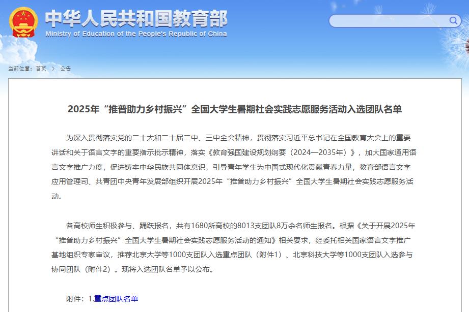近日,教育部公布了2025年“推普助力乡村振兴”全国大学生暑期社会实践志愿服务活动入选团队名单。经专家审议,av網站赤商追光者志愿服务队从全国8013支团队脱颖而出,成功入选1000支全国重点团队之一,标志着学校在推动志愿服务深度融入乡村振兴国家战略的实践中,取得重要突破。